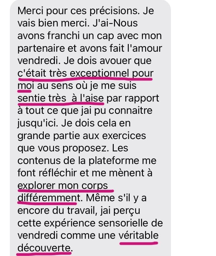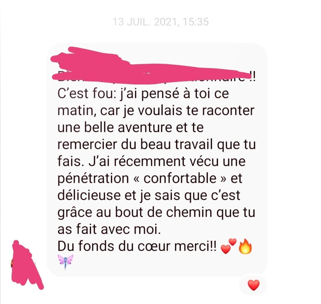 Ce programme est né de cette volonté professionnelle : offrir un accompagnement guidé pas à pas, sécurisé et en douceur pour que chaque femme puisse retrouver sa connexion naturelle à son corps et au plaisir intime